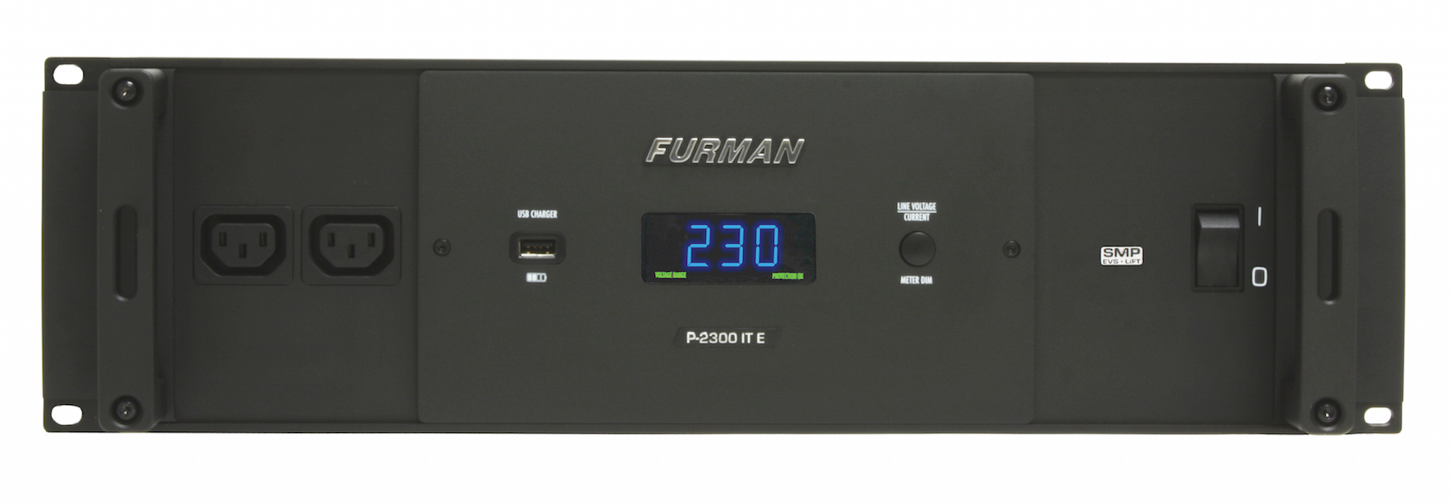 A P-2300 IT E előlapján lévő LED ablak „Protection OK“, „Extreme Voltage“ és színnel jelölt „Voltage Range“ visszajelzéssel mutatja a bejövő feszültséget, vagy a kimenő terhelést az átfogó ellenőrzés érdekében. Az előlapi USB csatlakozó a legtöbb média berendezést és mobiltelefont képes tölteni. C-13 univerzális konnektoraljzatok (12 darab a hátlapon, 2 darab az előlapon) és kivehető hálózati kábel biztosítja a kompatibilitást a helyi tápfeszültség igényekhez. (A Furman széles választékban kínál IEC adapterkábeleket és hálózati kábeleket – további információkért vegye fel a kapcsolatot a helyi Furman forgalmazóval.)